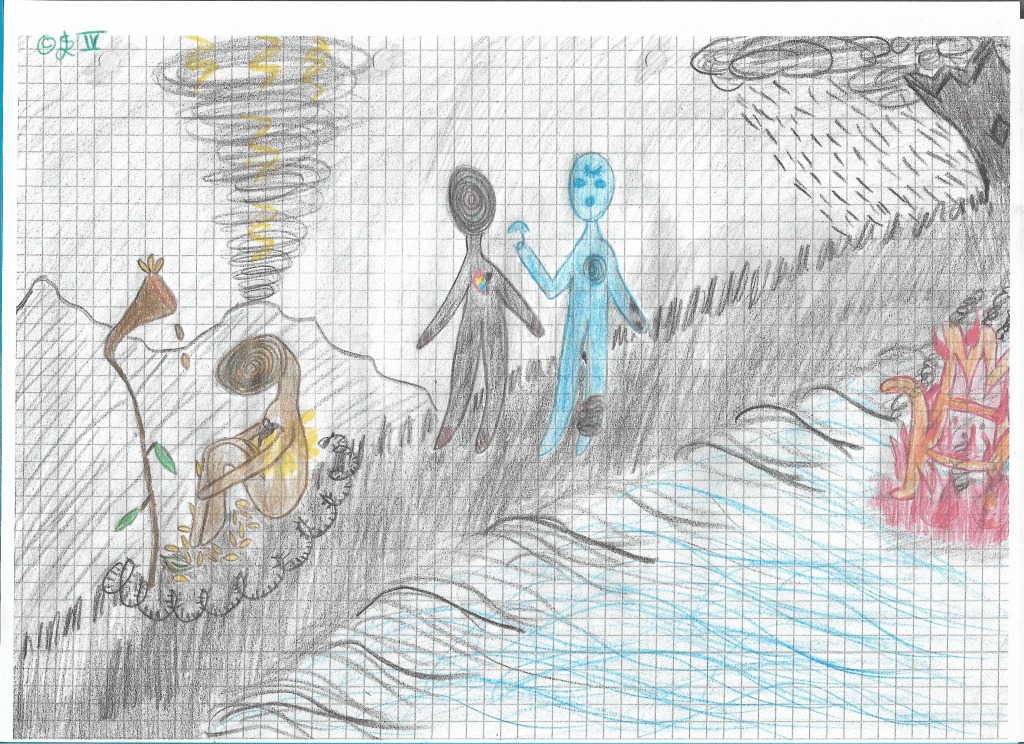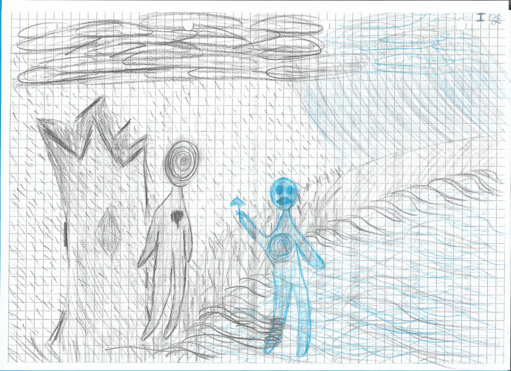 Eines Tages scheint die Sonne besonders stark und brennt erbarmungslos auf das Land. Die Sonnenblume lässt den Kopf hängen und trifft den Blick der Sirene. Schwach flüstert sie: „Wasser. Ich brauche Wasser.” Überrascht und überwältigt kommt die Sirene näher und wässert den Boden, in dem die Sonnenblume wächst. Sie bleibt und atmet zum ersten Mal auch den Duft der Blume ein. Die Sonnenblume, gestärkt vom Wasser, hebt ihren Blick dem Himmel entgegen. „Hallo”, sagt die Sirene vorsichtig und fügt hinzu, „du tanzt schön. Ich betrachte dich gern.” „Danke”, erwidert die Blume fast beiläufig, „ich bin nur eine Blume. Ich folge meiner Natur. Da ist gar nichts dabei.” Die Sirene stutzt: „Wie kann es dann sein, dass ich so etwas wie dich noch nie zuvor gesehen habe? Mein Reich ist groß, voll Dunkelheit und Stille. Ich kann die Dunkelheit kurzweilig mit den Seelen Ertrunkener erhelle. Ich kann die Stille mit meiner Stimme vertreiben. Aber nichts davon ist von Dauer. Du hingegen strahlst jeden Tag. Weder entlang der Küste, noch weit und breit im Meer gibt es Etwas vergleichbares.” „Ich bin eine Blume. Ich wachse in der Erde. Die Sonne und der Regen nähren mich. Ich brauche nichts weiter”, gibt die Blume abwehrend und als hätte sie gar nicht richtig zugehört zurück. „Ich wünschte”, sagt die Sirene zögerlich, „ich könnte es dir zeigen.” „Wenn du mich pflückst”, antwortet die Sonnenblume, „werde ich in wenigen Tagen vergehen.”